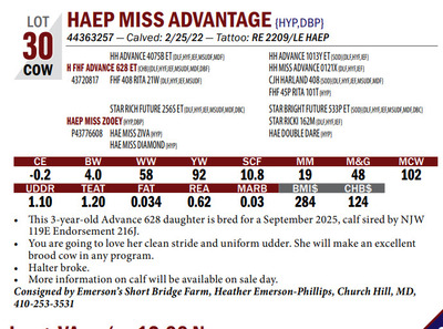 44363257 — Calved: 2/25/22 — Tattoo: RE 2209/LE HAEP This 3-year-old Advance 628 daughter is bred for a September 2025, calf sired by NJW 119E Endorsement 216J. You are going to love her clean stride and uniform udder. She will make an excellent brood cow in any program. Halter broke. More information on calf will be available on sale day