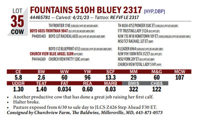44243457 — Calved: 1/18/21 — Tattoo: RE CVF/LE 710J A nice productive cow out of Historic and out of one of Lindsey’s retired show heifers Halter broke and friendly. Pasture exposed from 6/30 to sale day to JLCS Z426 Step Ahead F30 ET. Consigned by Churchview Farm, The Baldwins, Millersville, MD, 443-871-0573
