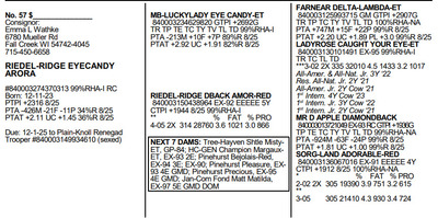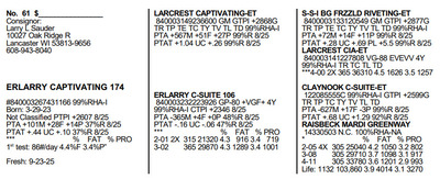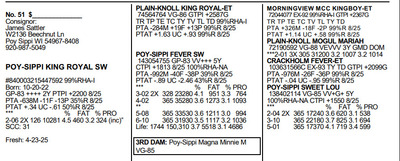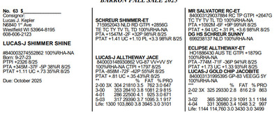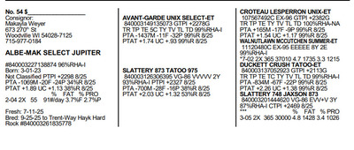 The BARRON FALL SALE 2025 120 N. 3rd Street, Barron WI, 54812 Great offering of genetics... Contact Agent: Aaron Ray Tompkins 336-363-4639 Catalog | Terms of Auction Download CATALOG Download ADDED LOTS PAGE 1 Download ADDED LOTS PAGE 2 Download ADDED LOTS PAGE 3 Catalog | Terms Download CATALOG Download ADDED LOTS PAGE 1 Download ADDED LOTS PAGE 2 Download ADDED LOTS PAGE 3 All Items (132) Cattle (102) Embryos (12) Semen (18) Categories All Items (132) Cattle (102) Embryos (12) Semen (18) Search Item #: Keyword: Search Catalog Item #: Keyword: 20 items per page 50 items per page 100 items per page Go to page #: 2 , 3 , 4 , 5 , 6 , 7 #50 – POY-SIPPI CADILLAC EVE #840003215447595 99%RHA-I Born: 6-11-23 Not Classified PTPI +2386 8/25 PTA +105M -7F -2P 35%R 8/25 PTAT +1.05 UC +.33 33%R 8/25 % FAT % PRO Fresh: 9-8-25 Location: 120 N. 3rd Street, Barron WI, 54812 Contact Agent: Aaron Ray Tompkins 336-363-4639 More Info / Bid Now Track this Item Sold High Bid: $3,250.00 – #1070 #50 – POY-SIPPI CADILLAC EVE Sold High Bid: $3,250 More Details More Info / Bid Track Item #840003215447595 99%RHA-I Born: 6-11-23 Not Classified PTPI +2386 8/25 PTA +105M -7F -2P 35%R 8/25 PTAT +1.05 UC +.33 33%R 8/25 % FAT % PRO Fresh: 9-8-25 Location: 120 N. 3rd Street, Barron WI, 54812 Contact Agent: Aaron Ray Tompkins 336-363-4639 #51 – POY-SIPPI KING ROYAL SW #840003215447592 99%RHA-I Born: 10-20-22 GP-83 ++++ 2Y PTPI +2200 8/25 PTA -638M -11F -13P 35%R 8/25 PTAT +.34 UC -.61 50%R 8/25 *** % FAT % PRO 2-06 2X 126 10281 4.5 460 3.2 324 (inc)” SCC: 31 Fresh: 4-23-25 Location: 120 N. 3rd Street, Barron WI, 54812 Contact Agent: Aaron Ray Tompkins 336-363-4639 More Info / Bid Now Track this Item Sold High Bid: $3,000.00 – #79 #51 – POY-SIPPI KING ROYAL SW Sold High Bid: $3,000 More Details More Info / Bid Track Item #840003215447592 99%RHA-I Born: 10-20-22 GP-83 ++++ 2Y PTPI +2200 8/25 PTA -638M -11F -13P 35%R 8/25 PTAT +.34 UC -.61 50%R 8/25 *** % FAT % PRO 2-06 2X 126 10281 4.5 460 3.2 324 (inc)” SCC: 31 Fresh: 4-23-25 Location: 120 N. 3rd Street, Barron WI, 54812 Contact Agent: Aaron Ray Tompkins 336-363-4639 #52 – POY-SIPPI EYECANDY MIDNIGHT #840003250031051 99%RHA-I Born: 10-19-23 Not Classified PTPI +2237 8/25 PTA -747M -29F -20P 34%R 8/25 PTAT +1.63 UC +.86 30%R 8/25 Fresh: 10-8-25 Location: 120 N. 3rd Street, Barron WI, 54812 Contact Agent: Aaron Ray Tompkins 336-363-4639 More Info / Bid Now Track this Item No Bids Starting at $1,500.00 Login to Bid #52 – POY-SIPPI EYECANDY MIDNIGHT Starting at $1,500.00 Login to Bid More Details More Info / Bid Track Item #840003250031051 99%RHA-I Born: 10-19-23 Not Classified PTPI +2237 8/25 PTA -747M -29F -20P 34%R 8/25 PTAT +1.63 UC +.86 30%R 8/25 Fresh: 10-8-25 Location: 120 N. 3rd Street, Barron WI, 54812 Contact Agent: Aaron Ray Tompkins 336-363-4639 #52.5 – POY-SIPPI EC MIDNIGHT PENDING Born: 10-8-25 Location: 120 N. 3rd Street, Barron WI, 54812 Contact Agent: Aaron Ray Tompkins 336-363-4639 More Info / Bid Now Track this Item Sold High Bid: $1,750.00 – #88 #52.5 – POY-SIPPI EC MIDNIGHT Sold High Bid: $1,750 More Details More Info / Bid Track Item PENDING Born: 10-8-25 Location: 120 N. 3rd Street, Barron WI, 54812 Contact Agent: Aaron Ray Tompkins 336-363-4639 #53 – MILKINAIRE ALT AIR ONE-RED #840003288240847 99%RHA-I Born: 11-01-24 GTPI +2151G 8/25 PTA -994M -37F -30P 81%R 8/25 PTAT +2.55 UC +1.57 81%R 8/25 Location: 120 N. 3rd Street, Barron WI, 54812 Contact Agent: Aaron Ray Tompkins 336-363-4639 More Info / Bid Now Track this Item Sold High Bid: $2,300.00 – #28 #53 – MILKINAIRE ALT AIR ONE-RED Sold High Bid: $2,300 More Details More Info / Bid Track Item #840003288240847 99%RHA-I Born: 11-01-24 GTPI +2151G 8/25 PTA -994M -37F -30P 81%R 8/25 PTAT +2.55 UC +1.57 81%R 8/25 Location: 120 N. 3rd Street, Barron WI, 54812 Contact Agent: Aaron Ray Tompkins 336-363-4639 #54 – ALBE-MAK SELECT JUPITER #840003227138874 96%RHA-I Born: 3-01-23 Not Classified PTPI +2298 8/25 PTA -1069M -20F -24P 34%R 8/25 PTAT +1.89 UC +1.13 38%R 8/25 % FAT % PRO 2-04 2X 55 91#/day 3.7%F 2.7%P Fresh: 7-11-25 Bred: 9-25-25 to Trent-Way Hayk Hard Rock #840003261835778 Location: 120 N. 3rd Street, Barron WI, 54812 Contact Agent: Aaron Ray Tompkins 336-363-4639 More Info / Bid Now Track this Item Sold High Bid: $2,750.00 – #18 #54 – ALBE-MAK SELECT JUPITER Sold High Bid: $2,750 More Details More Info / Bid Track Item #840003227138874 96%RHA-I Born: 3-01-23 Not Classified PTPI +2298 8/25 PTA -1069M -20F -24P 34%R 8/25 PTAT +1.89 UC +1.13 38%R 8/25 % FAT % PRO 2-04 2X 55 91#/day 3.7%F 2.7%P Fresh: 7-11-25 Bred: 9-25-25 to Trent-Way Hayk Hard Rock #840003261835778 Location: 120 N. 3rd Street, Barron WI, 54812 Contact Agent: Aaron Ray Tompkins 336-363-4639 #55 – FRIESIAN-KNOLL MAX WESTMAX #840003238170165 99%RHA-I Born: 2-23-21 VG-87 VVEVV 4Y CTPI +2010 8/25 PTA -1236M -27F -28P 43%R 8/25 PTAT +1.18 UC +.04 51%R 8/25 *** % FAT % PRO 2-04 2X 305 14350 5.0 717 3.7 531 365 17180 5.0 865 3.7 633 Sells fresh, Due: 10-12-25 Location: 120 N. 3rd Street, Barron WI, 54812 Contact Agent: Aaron Ray Tompkins 336-363-4639 More Info / Bid Now Track this Item Sold High Bid: $3,500.00 – #25 #55 – FRIESIAN-KNOLL MAX WESTMAX Sold High Bid: $3,500 More Details More Info / Bid Track Item #840003238170165 99%RHA-I Born: 2-23-21 VG-87 VVEVV 4Y CTPI +2010 8/25 PTA -1236M -27F -28P 43%R 8/25 PTAT +1.18 UC +.04 51%R 8/25 *** % FAT % PRO 2-04 2X 305 14350 5.0 717 3.7 531 365 17180 5.0 865 3.7 633 Sells fresh, Due: 10-12-25 Location: 120 N. 3rd Street, Barron WI, 54812 Contact Agent: Aaron Ray Tompkins 336-363-4639 #56 – WELSH-EDGE GAMECHANGE RETRO #840003259989936 99%RHA-I Born: 10-08-23 Not Classified PTPI +2163 8/25 PTA -557M -28F -26P 34%R 8/25 PTAT +.94 UC +.46 34%R 8/25 *** % FAT % PRO Fresh: 9-6-25 Location: 120 N. 3rd Street, Barron WI, 54812 Contact Agent: Aaron Ray Tompkins 336-363-4639 More Info / Bid Now Track this Item Sold High Bid: $4,800.00 – #19 #56 – WELSH-EDGE GAM