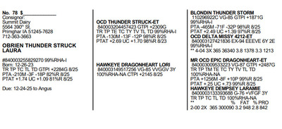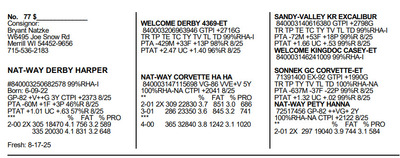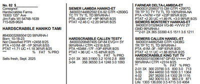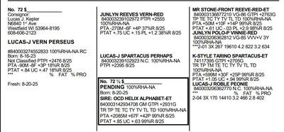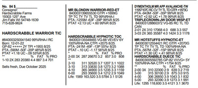 The BARRON FALL SALE 2025 120 N. 3rd Street, Barron WI, 54812 Great offering of genetics... Contact Agent: Aaron Ray Tompkins 336-363-4639 Catalog | Terms of Auction Download CATALOG Download ADDED LOTS PAGE 1 Download ADDED LOTS PAGE 2 Download ADDED LOTS PAGE 3 Catalog | Terms Download CATALOG Download ADDED LOTS PAGE 1 Download ADDED LOTS PAGE 2 Download ADDED LOTS PAGE 3 All Items (132) Cattle (102) Embryos (12) Semen (18) Categories All Items (132) Cattle (102) Embryos (12) Semen (18) Search Item #: Keyword: Search Catalog Item #: Keyword: 20 items per page 50 items per page 100 items per page Go to page #: 2 , 3 , 4 , 5 , 6 , 7 #69 – EZ-WITT BARB JIZZY JAZZY #840003218787430 99%RHA-I Born: 6-01-23 PTPI +2170 8/25 PTA -319M -51F -23P 37%R 8/25 PTAT +1.79 UC +1.49 38%R 8/25 Due: 11-2-25 Location: 120 N. 3rd Street, Barron WI, 54812 Contact Agent: Aaron Ray Tompkins 336-363-4639 More Info / Bid Now Track this Item No Bids Starting at $1,500.00 Login to Bid #69 – EZ-WITT BARB JIZZY JAZZY Starting at $1,500.00 Login to Bid More Details More Info / Bid Track Item #840003218787430 99%RHA-I Born: 6-01-23 PTPI +2170 8/25 PTA -319M -51F -23P 37%R 8/25 PTAT +1.79 UC +1.49 38%R 8/25 Due: 11-2-25 Location: 120 N. 3rd Street, Barron WI, 54812 Contact Agent: Aaron Ray Tompkins 336-363-4639 #70 – NAT-WAY EYE CANDY HONEST #840003266245362 99%RHA-I Born: 8-06-23 Not Classified PTPI +2418 8/25 PTA -540M -5F -14P 32%R 8/25 PTAT +2.22 UC +1.22 31%R 8/25 *** % FAT % PRO Fresh: 8-31-25 Location: 120 N. 3rd Street, Barron WI, 54812 Contact Agent: Aaron Ray Tompkins 336-363-4639 More Info / Bid Now Track this Item No Bids Starting at $1,500.00 Login to Bid #70 – NAT-WAY EYE CANDY HONEST Starting at $1,500.00 Login to Bid More Details More Info / Bid Track Item #840003266245362 99%RHA-I Born: 8-06-23 Not Classified PTPI +2418 8/25 PTA -540M -5F -14P 32%R 8/25 PTAT +2.22 UC +1.22 31%R 8/25 *** % FAT % PRO Fresh: 8-31-25 Location: 120 N. 3rd Street, Barron WI, 54812 Contact Agent: Aaron Ray Tompkins 336-363-4639 #71 – LUCAS-J REBEL ZORRO #840003274552818 100%RHA-NA RC Born: 7-25-23 PTPI +2541 PTA -206M +13F +4P 34%R 8/25 PTAT +.23 UC +.29 33%R 8/25 Due in Jan. 2026 to Siemers Parbo-ET #840003243347747 Location: 120 N. 3rd Street, Barron WI, 54812 Contact Agent: Aaron Ray Tompkins 336-363-4639 More Info / Bid Now Track this Item Sold High Bid: $3,400.00 – #54 #71 – LUCAS-J REBEL ZORRO Sold High Bid: $3,400 More Details More Info / Bid Track Item #840003274552818 100%RHA-NA RC Born: 7-25-23 PTPI +2541 PTA -206M +13F +4P 34%R 8/25 PTAT +.23 UC +.29 33%R 8/25 Due in Jan. 2026 to Siemers Parbo-ET #840003243347747 Location: 120 N. 3rd Street, Barron WI, 54812 Contact Agent: Aaron Ray Tompkins 336-363-4639 #72 – LUCAS-J VERN PERSEUS #840003274552833 100%RHA-NA RC Born: 8-16-23 Not Classified PTPI +2476 8/25 PTA -90M -8F +3P 18%R 8/25 PTAT +.84 UC +.47 18%R 8/25 *** % FAT % PRO Fresh: 8-20-25 Location: 120 N. 3rd Street, Barron WI, 54812 Contact Agent: Aaron Ray Tompkins 336-363-4639 More Info / Bid Now Track this Item Sold High Bid: $2,250.00 – #14 #72 – LUCAS-J VERN PERSEUS Sold High Bid: $2,250 More Details More Info / Bid Track Item #840003274552833 100%RHA-NA RC Born: 8-16-23 Not Classified PTPI +2476 8/25 PTA -90M -8F +3P 18%R 8/25 PTAT +.84 UC +.47 18%R 8/25 *** % FAT % PRO Fresh: 8-20-25 Location: 120 N. 3rd Street, Barron WI, 54812 Contact Agent: Aaron Ray Tompkins 336-363-4639 #73 – LUCAS-J TOP GADJET #840003274552791 100%RHA-NA RC Born: 6-01-23 Not Classified PTPI +2539 8/25 PTA +261M +11F +3P 37%R 8/25 PTAT .67 UC +.82 38%R 8/25 *** % FAT % PRO 2-00 X 105 5900 3.7 218 3.0 177 (inc)” Milking 70#/day SCC: 13 Location: 120 N. 3rd Street, Barron WI, 54812 Contact Agent: Aaron Ray Tompkins 336-363-4639 More Info / Bid Now Track this Item No Bids Starting at $1,500.00 Login to Bid #73 – LUCAS-J TOP GADJET Starting at $1,500.00 Login to Bid More Details More Info / Bid Track Item #840003274552791 100%RHA-NA RC Born: 6-01-23 Not Classified PTPI +2539 8/25 PTA +261M +11F +3P 37%R 8/25 PTAT .67 UC +.82 38%R 8/25 *** % FAT % PRO 2-00 X 105 5900 3.7 218 3.0 177 (inc)” Milking 70#/day SCC: 13 Location: 120 N. 3rd Street, Barron WI, 54812 Contact Agent: Aaron Ray Tompkins 336-363-4639 #74 – PENDING 99%RHA-I Born: 9-2-25 Location: 120 N. 3rd Street, Barron WI, 54812 Contact Agent: Aaron Ray Tompkins 336-363-4639 More Info / Bid Now Track this Item Sold High Bid: $2,500.00 – #23 #74 – PENDING Sold High Bid: $2,500 More Details More Info / Bid Track Item 99%RHA-I Born: 9-2-25 Location: 120 N. 3rd Street, Barron WI, 54812 Contact Agent: Aaron Ray Tompkins 336-363-4639 #75 – BREMER ZABRILA WHATSHE #840003224338935 99%RHA-I TR TC TL TD GTPI +2739G 8/25 Born: 7-10-21 GP-83 +VF+V 3Y PTA -567M +34F +13P 84%R 8/25 PTAT +.54 UC +1.31 84%R 8/25 *** % FAT % PRO 1-11 2X 305 18460 5.0 915 3.8 700 365 21520 5.0 1073 3.9 830 3-04 272 24450 4.4 1072 3.6 883 Sells fresh Location: 120 N. 3rd Street, Barron WI, 54812 Contact Agent: Aaron Ray Tompkins 336-363-4639 More Info / Bid Now Track this Item No Bids Starting at $1,500.00 Login to Bid #75 – BREMER ZABRILA WHATSHE Starting at $1,500.00 Login to Bid More Details More Info / Bid Track Item #840003224338935 99%RHA-I TR TC TL TD GTPI +2739G 8/25 Born: 7-10-21 GP-83 +VF+V 3Y PTA -567M +34F +13P 84%R 8/25 PTAT +.54 UC +1.31 84%R 8/25 *** % FAT % PRO 1-11 2X 305 18460 5.0 915 3.8 700 365 21520 5.0 1073 3.9 830 3-04 272 24450 4.4 1072 3.6 883 Sells fresh Location: 120 N. 3rd Street, Barron WI, 54812 Contact Agent: Aaron Ray Tompkins 336-363-4639 #76 – NAT-WAY COLLISION HAITI #840003266245367 99%RHA-I Born: 10-09-23 PTPI +2144 8/25 PTA -518M -36F -21P 35%R 8/25 PTAT +1.58 UC +1.42 37%R 8/25 Due: 12-15-25 to Jinx Location: 120 N. 3rd Street, Barron WI, 54812 Contact Agent: Aaron Ray Tompkins 336-363-4639 More Info / Bid Now Track this Item Sold High Bid: $2,900.00 – #47 #76 – NAT-WAY COLLISION HAITI Sold High Bid: $2,900 More Details More Info / Bid T