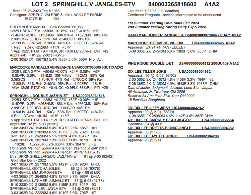Born: 06-26-2023 Tag # 1066Last fresh 7/23/25 (1st lactation)
