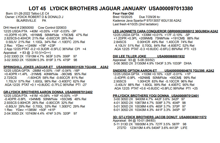 Bred 10/20/25 Due 7/29/26 to: Kadence Java Sparta-P 97013057 6GU130 A2A2 Last fresh 4/10/25 (2nd lactation)