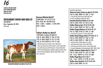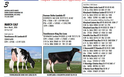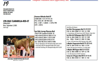 39th Annual Waupaca-Waushara Show Opportunity Sale 602 South St, Weyauwega WI, 54983 Multi-Breed Offering of Top Shelf Genetics Contact Agent: Catalog | Register For Auction | Terms of Auction Download CATALOG Catalog | Register | Terms Download CATALOG All Items (65) Cattle (64) Semen (1) Categories All Items (65) Cattle (64) Semen (1) Search Item #: Keyword: Search Catalog Item #: Keyword: 20 items per page 50 items per page 100 items per page Go to page #: 1 , 2 , 3 , 4 #1 – MS TURBO FORTUNE-RED-ET 3291062672 Born: March 9, 2025 Spring Yearling Location: 602 South St, Weyauwega WI, 54983 More Info / Bid Now Track this Item Register for Auction High Bid: $1,000.00 – #1001 Login to Bid #1 – MS TURBO FORTUNE-RED-ET High Bid: $1,000 Login to Bid More Details More Info / Bid Track Item Register 3291062672 Born: March 9, 2025 Spring Yearling Location: 602 South St, Weyauwega WI, 54983 #2 – CRYSTAL-STAR A BROOKLYN-ET 3301017904 Born: December 8, 2025 Winter Calf Location: 602 South St, Weyauwega WI, 54983 More Info / Bid Now Track this Item Register for Auction No Bids Starting at $1,000.00 Login to Bid #2 – CRYSTAL-STAR A BROOKLYN-ET Starting at $1,000.00 Login to Bid More Details More Info / Bid Track Item Register 3301017904 Born: December 8, 2025 Winter Calf Location: 602 South St, Weyauwega WI, 54983 #3 – MARCH CALF Born: March , 2026 Spring Calf Location: 602 South St, Weyauwega WI, 54983 More Info / Bid Now Track this Item Register for Auction No Bids Starting at $1,000.00 Login to Bid #3 – MARCH CALF Starting at $1,000.00 Login to Bid More Details More Info / Bid Track Item Register Born: March , 2026 Spring Calf Location: 602 South St, Weyauwega WI, 54983 #4 – YELLOWSTONE ANOTHER ONE-ET 3309747672 TR TP TC TV TL TD Born: September 10, 2025 GTPI +2352G +2.77T +1.71UDC +2.06FLC 12/25 Location: 602 South St, Weyauwega WI, 54983 More Info / Bid Now Track this Item Register for Auction No Bids Starting at $1,000.00 Login to Bid #4 – YELLOWSTONE ANOTHER ONE-ET Starting at $1,000.00 Login to Bid More Details More Info / Bid Track Item Register 3309747672 TR TP TC TV TL TD Born: September 10, 2025 GTPI +2352G +2.77T +1.71UDC +2.06FLC 12/25 Location: 602 South St, Weyauwega WI, 54983 #5 – DBJ&H CINNAMON TWIST-RED-ET 3283517020 Born: June 1, 2025 GTPI +2254G 12/25 Summer Yearling Location: 602 South St, Weyauwega WI, 54983 More Info / Bid Now Track this Item Register for Auction No Bids Starting at $1,000.00 Login to Bid #5 – DBJ&H CINNAMON TWIST-RED-ET Starting at $1,000.00 Login to Bid More Details More Info / Bid Track Item Register 3283517020 Born: June 1, 2025 GTPI +2254G 12/25 Summer Yearling Location: 602 South St, Weyauwega WI, 54983 #6 – MILKSOURCE KING D CLAIRE-ET 3281425887 Born: September 12, 2025 Fall Calf Location: 602 South St, Weyauwega WI, 54983 More Info / Bid Now Track this Item Register for Auction No Bids Starting at $1,000.00 Login to Bid #6 – MILKSOURCE KING D CLAIRE-ET Starting at $1,000.00 Login to Bid More Details More Info / Bid Track Item Register 3281425887 Born: September 12, 2025 Fall Calf Location: 602 South St, Weyauwega WI, 54983 #7 – MS TENTASTIC FASTEST-TW 3297824998 TR TP TC TV TL TD Born: May 7, 2025 GTPI +2560G +596M +1.80T +1.05UDC A1/A2 Location: 602 South St, Weyauwega WI, 54983 More Info / Bid Now Track this Item Register for Auction No Bids Starting at $1,000.00 Login to Bid #7 – MS TENTASTIC FASTEST-TW Starting at $1,000.00 Login to Bid More Details More Info / Bid Track Item Register 3297824998 TR TP TC TV TL TD Born: May 7, 2025 GTPI +2560G +596M +1.80T +1.05UDC A1/A2 Location: 602 South St, Weyauwega WI, 54983 #8 – A-L-H HULU FAN GIRL-ET 3297824944 TR TP TC TL TD Born: March 1, 2025 GTPI +2549G +2.25T +1.93UDC +1.81FLC A2/A2 Spring Yearling Location: 602 South St, Weyauwega WI, 54983 More Info / Bid Now Track this Item Register for Auction No Bids Starting at $1,000.00 Login to Bid #8 – A-L-H HULU FAN GIRL-ET Starting at $1,000.00 Login to Bid More Details More Info / Bid Track Item Register 3297824944 TR TP TC TL TD Born: March 1, 2025 GTPI +2549G +2.25T +1.93UDC +1.81FLC A2/A2 Spring Yearling Location: 602 South St, Weyauwega WI, 54983 #9 – MEAD-MANOR U ANNEBEL-RED-ET 3306298073 Born: June 7, 2025 GTPI +1821G +1.62T +1.24FLC Summer Yearling Location: 602 South St, Weyauwega WI, 54983 More Info / Bid Now Track this Item Register for Auction No Bids Starting at $1,000.00 Login to Bid #9 – MEAD-MANOR U ANNEBEL-RED-ET Starting at $1,000.00 Login to Bid More Details More Info / Bid Track Item Register 3306298073 Born: June 7, 2025 GTPI +1821G +1.62T +1.24FLC Summer Yearling Location: 602 South St, Weyauwega WI, 54983 #10 – ELECTRAS AVENGER ENDLESS-ET 3309802945 Born: December 1, 2025 Winter Calf Location: 602 South St, Weyauwega WI, 54983 More Info / Bid Now Track this Item Register for Auction No Bids Starting at $1,000.00 Login to Bid #10 – ELECTRAS AVENGER ENDLESS-ET Starting at $1,000.00 Login to Bid More Details More Info / Bid Track Item Register 3309802945 Born: December 1, 2025 Winter Calf Location: 602 South St, Weyauwega WI, 54983 #11 – VIR-CLAR GOODY 2 SHOES-ET 3318775692 RC Born: December 3, 2025 Winter Calf Location: 602 South St, Weyauwega WI, 54983 More Info / Bid Now Track this Item Register for Auction No Bids Starting at $1,000.00 Login to Bid #11 – VIR-CLAR GOODY 2 SHOES-ET Starting at $1,000.00 Login to Bid More Details More Info / Bid Track Item Register 3318775692 RC Born: December 3, 2025 Winter Calf Location: 602 South St, Weyauwega WI, 54983 #12 – STONE-FRONT HULU ATHENA 3295558294 RC Born: September 1, 2025 Fall Calf Location: 602 South St, Weyauwega WI, 54983 More Info / Bid Now Track this Item Register for Auction No Bids Starting at $1,000.00 Login to Bid #12 – STONE-FRONT HULU ATHENA Starting at $1,000.00 Login to Bid More Details More Info / Bid Track Item Register 3295558294 RC Born: September 1, 2025 Fall Calf Location: 602 South St, Weyauwega WI, 54983 #13 – ROYAL