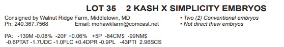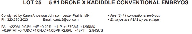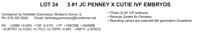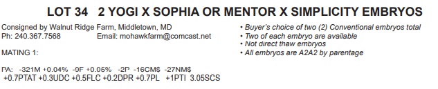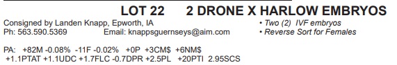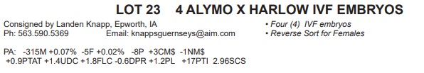 Golden Future Embryo Online Sale Online only Auction, TBA ., Only -Selling price is per Embryo -Buyer is responsible for all costs of shipping expenses. Contact Agent: Catalog | Terms of Auction Download CATALOG Catalog | Terms Download CATALOG All Items (34) Embryos (34) Categories All Items (34) Embryos (34) Search Item #: Keyword: Search Catalog Item #: Keyword: 20 items per page 50 items per page 100 items per page Go to page #: 1 , 2 #21 – Bank on Me x AP Four (4) IVF embryos Reverse Sort for Females Location: Epworth, IA, , Contact Agent: Landen Knapp / 563.590.5369 More Info / Bid Now Track this Item Reserve Met Sold High Bid: $450.00 Auction Type: Quantity x Price Quantity: 4 Bidding has closed on this lot #21 – Bank on Me x AP Quantity x PriceQuantity: 4 Sold High Bid: $450 Reserve Met Closed More Details More Info / Bid Track Item Four (4) IVF embryos Reverse Sort for Females Location: Epworth, IA, , Contact Agent: Landen Knapp / 563.590.5369 #22 – Harlow x Drone Two (2) IVF embryos Reverse Sort for Females Location: Epworth, IA, , Contact Agent: Landen Knapp / 563.590.5369 More Info / Bid Now Track this Item Reserve Not Met Sold High Bid: $450.00 Auction Type: Quantity x Price Quantity: 2 Bidding has closed on this lot #22 – Harlow x Drone Quantity x PriceQuantity: 2 Sold High Bid: $450 Reserve Not Met Closed More Details More Info / Bid Track Item Two (2) IVF embryos Reverse Sort for Females Location: Epworth, IA, , Contact Agent: Landen Knapp / 563.590.5369 #23 – Harlow x Alymo Four (4) IVF embryos Reverse Sort for Females Location: Epworth, IA, , Contact Agent: Landen Knapp / 563.590.5369 More Info / Bid Now Track this Item Reserve Not Met Sold High Bid: $350.00 Auction Type: Quantity x Price Quantity: 4 Bidding has closed on this lot #23 – Harlow x Alymo Quantity x PriceQuantity: 4 Sold High Bid: $350 Reserve Not Met Closed More Details More Info / Bid Track Item Four (4) IVF embryos Reverse Sort for Females Location: Epworth, IA, , Contact Agent: Landen Knapp / 563.590.5369 #24 – JC Penney x Cutie Three (3) #1 IVF embryos Reverse Sorted for Females Resulting calves are potential 6th generation Excellents Location: Mulberry Grove, IL, , Contact Agent: Hartdale Guernseys / 618.292.9509 More Info / Bid Now Track this Item Reserve Met Sold High Bid: $800.00 Auction Type: Quantity x Price Quantity: 3 Bidding has closed on this lot #24 – JC Penney x Cutie Quantity x PriceQuantity: 3 Sold High Bid: $800 Reserve Met Closed More Details More Info / Bid Track Item Three (3) #1 IVF embryos Reverse Sorted for Females Resulting calves are potential 6th generation Excellents Location: Mulberry Grove, IL, , Contact Agent: Hartdale Guernseys / 618.292.9509 #25 – Drone x Kadiddle Five (5) #1 conventional embryos Embryos are A2A2 by parentage Location: Lester Prairie, MN, , Contact Agent: Karen Anderson Johnson / 320.395.2023 More Info / Bid Now Track this Item Reserve Met Sold High Bid: $450.00 Auction Type: Quantity x Price Quantity: 5 Bidding has closed on this lot #25 – Drone x Kadiddle Quantity x PriceQuantity: 5 Sold High Bid: $450 Reserve Met Closed More Details More Info / Bid Track Item Five (5) #1 conventional embryos Embryos are A2A2 by parentage Location: Lester Prairie, MN, , Contact Agent: Karen Anderson Johnson / 320.395.2023 #26 – Aarons Levi x Taytor Four (4) #1 IVF embryos Made with reverse sorted semen for females Embryos are A2A2 by parentage Location: Marengo, IA, , Contact Agent: Dana & Madison Sickles / 319.240.5715 More Info / Bid Now Track this Item Reserve Not Met Sold High Bid: $400.00 Auction Type: Quantity x Price Quantity: 4 Bidding has closed on this lot #26 – Aarons Levi x Taytor Quantity x PriceQuantity: 4 Sold High Bid: $400 Reserve Not Met Closed More Details More Info / Bid Track Item Four (4) #1 IVF embryos Made with reverse sorted semen for females Embryos are A2A2 by parentage Location: Marengo, IA, , Contact Agent: Dana & Madison Sickles / 319.240.5715 #27 – Quarrel x Drone (4) / Top Gun (4) Buyer’s choice of four (4) embryos total There are 4 embryos of each mating available Made with reverse sorted semen for females Resulting calves are potential 8th generation Excellents Location: Epworth, IA, , Contact Agent: Landen Knapp / 563.590.5369 More Info / Bid Now Track this Item Reserve Met Sold High Bid: $350.00 Auction Type: Quantity x Price Quantity: 4 Bidding has closed on this lot #27 – Quarrel x Drone (4) / Top Gun (4) Quantity x PriceQuantity: 4 Sold High Bid: $350 Reserve Met Closed More Details More Info / Bid Track Item Buyer’s choice of four (4) embryos total There are 4 embryos of each mating available Made with reverse sorted semen for females Resulting calves are potential 8th generation Excellents Location: Epworth, IA, , Contact Agent: Landen Knapp / 563.590.5369 #28 – Nope x Kash or Mentor Buyer’s choice of two (2) Conventional embryos There are two of each embryo available Not direct thaw embryos Mentor embryos are A2A2 by parentage Location: Middletown, MD, , Contact Agent: Walnut Ridge Farm / 240.367.7568 More Info / Bid Now Track this Item Reserve Not Met Sold High Bid: $175.00 Auction Type: Quantity x Price Quantity: 2 Bidding has closed on this lot #28 – Nope x Kash or Mentor Quantity x PriceQuantity: 2 Sold High Bid: $175 Reserve Not Met Closed More Details More Info / Bid Track Item Buyer’s choice of two (2) Conventional embryos There are two of each embryo available Not direct thaw embryos Mentor embryos are A2A2 by parentage Location: Middletown, MD, , Contact Agent: Walnut Ridge Farm / 240.367.7568 #29 – MAS x Nouget Five (5) embryos Buyer’s choice of IVF or conventional & sexing options Choice to be made by January 1, 2021 Location: Lester Prairie, MN, , Contact Agent: Donna Anderson / 320.395.2023 More Info / Bid Now Track this Item Reserve Met Sold High Bid: $350.00 Auction Type: Quantity x Price Quantity: 5 Bidding has closed on this lot #29 – MAS x Nouget Quantity x PriceQuan