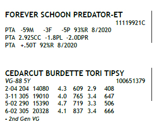 born ? 10/07/2017 Fresh 3/9/20 - 2-05 202 13182 3.2 427 2.9 529 Inc SCC 0.8 ? Potential 3rd Gen EX, VG BRED 6/17/20 to cedarcut colata’s champion 100722079