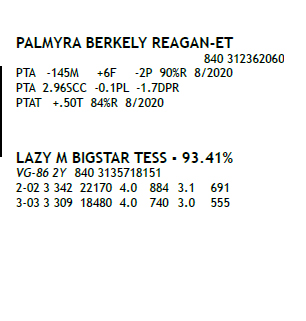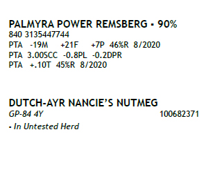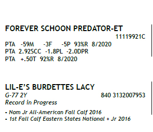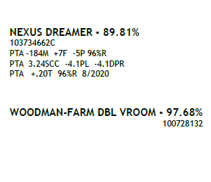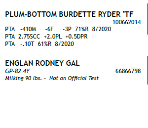 born ? 03/13/2018 Milking 68 lbs 4.3/3.3 ? Fresh 6/6/20 2-02 113 7494 3.8 285 3.2 243 Inc ME 23337 786P / SCC 0.3 ? Potential 5th Gen EX, VG BRED 9/19/20 to PALYMYRA ROANOKE 840 3135447754