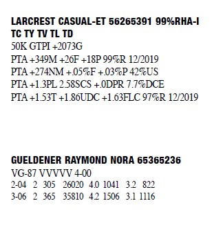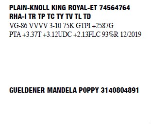 72663933 99%RHA-I Born: December 1, 2013 #2106 VG-88 EVVVV 5-08 1-11 2 352 29580 4.5 1338 3.1 916 3-00 2 320 29360 3.8 1126 3.1 922 4-00 2 356 31820 4.3 1376 3.1 978 5-01 2 363 30485 3.9 1181 3.2 985 Bred 7/3/2019 to Woodcrest King Doc 3132417775 250HO12961