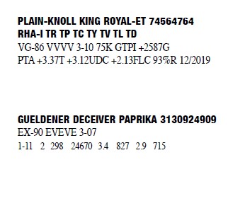 314804944 99%RHA-I Born: May 3, 2017 #2444 GP-80 GGG++ 2-03 1-11 2 262 20947 2.9 604 3.3 694 (RIP) Milking 84lbs. SCC 54 Bred 12/18/2019 to Gueldener BWMarsh Julius-ET 60422927 7HO7490