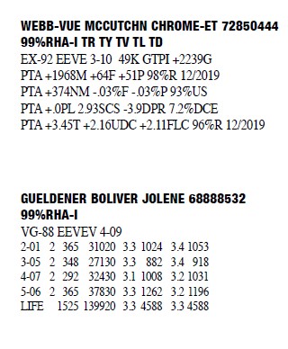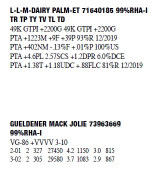 73963680 100%RHA Born: May 1, 2015 #2250 VG-88 VEVVV 3-08 2-06 2 356 36980 3.7 1369 2.9 1090 3-07 2 305 40900 3.0 1208 3.0 1229 4-08 2 9 1031 5.6 58 3.9 40 (RIP) Milking 149lbs. SCC 87 Sells Fresh 1/10/2020