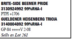 3140804962 99%RHA-I Born: October 5, 2017 #2462 2-00 2 88 6349 4.6 294 3.1 91 (RIP) Milking 86lbs. SCC 25 Bred 1/28/2020 to Peak Tropic-ET 3145229820 250H14605