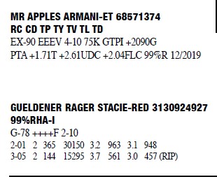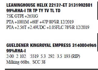 3132219788 99%RHA-I Born: September 13, 2017 #1789 2-02 2 48 3180 4.2 134 3.3 104 (RIP) Milking 66Lbs. SCC 14 Bred 2/7/2020 to Peak Tropic-ET 3145229820 250H14605