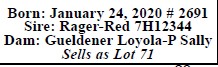 3214931220 Born: January 24, 2020 # 2691 Sire: Rager-Red 7H12344 Dam: Gueldener Loyola-P Sally