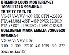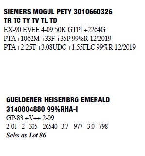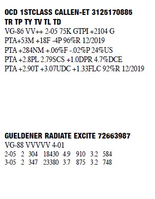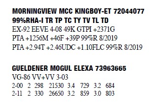 73963620 99%RHA-I Born: November 14, 2014 #2190 VG-86 V+VVV 4-09 1-11 2 334 27730 3.7 1017 3.1 848 3-00 2 309 27270 4.0 1079 3.0 822 4-02 2 354 38700 3.8 1475 3.0 1156 Bred 5/31/2019 to Siemers Doc Hancock 3144882821 250H14579