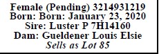 3214931219 Born: Born: January 23, 2020 Sire: Luster P 7H14160 Dam: Gueldener Louis Elsie