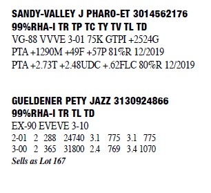72663902 99%RHA-I Born: September 2, 2013 #2075 EX-90 EEVVE 5-11 2-01 2 365 27870 3.3 916 3.2 895 3-04 2 333 34000 3.2 1094 3.1 1040 4-05 2 365 35710 3.3 1185 3.2 1131 LIFE 1117 100810 3.3 3319 3.2 3187 5-07 2 272 31310 3.1 963 3.0 937 (RIP) Milking 92lbs. SCC 162 Bred 11/26/2019 to Peak Tropic-ET 3145229820 250H14605