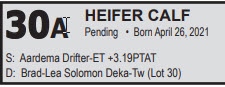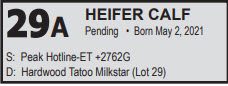 40th Anniversary Celebration Sale W4226 Hwy 23, Fond du Lac WI, 54937 Great offering of genetics... Contact Agent: Aaron Ray Tompkins 336-363-4639 Catalog | Terms of Auction Download CATALOG Download GENOMIC LOTS Download GENOMIC EXCEL FILE Download UPDATES Download ADDED LOTS Download SALE ORDER Catalog | Terms Download CATALOG Download GENOMIC LOTS Download GENOMIC EXCEL FILE Download UPDATES Download ADDED LOTS Download SALE ORDER All Items (92) All Lots (5) Cattle (86) Semen (1) Categories All Items (92) All Lots (5) Cattle (86) Semen (1) Search Item #: Keyword: Search Catalog Item #: Keyword: 20 items per page 50 items per page 100 items per page Go to page #: 1 , 2 , 3 , 4 , 5 #13 – BELLA-VIEW DBCK LACE-RED-ET LA-VIEW DBCK LACE-RED-ET 840003141605645 Born March 2, 2018 99%RHA-I Good Plus-83 VG-MS 2-05 1-11 2x 365d 27,206 3.7 998 3.2 870” Nom. Jr. All-American R&W Spring Calf 2018 FRESH Location: W4226 Hwy 23, Fond du Lac WI, 54937 Contact Agent: Aaron Ray Tompkins 336-363-4639 More Info / Bid Now Track this Item No Bids Starting at $500.00 Login to Bid #13 – BELLA-VIEW DBCK LACE-RED-ET Starting at $500.00 Login to Bid More Details More Info / Bid Track Item LA-VIEW DBCK LACE-RED-ET 840003141605645 Born March 2, 2018 99%RHA-I Good Plus-83 VG-MS 2-05 1-11 2x 365d 27,206 3.7 998 3.2 870” Nom. Jr. All-American R&W Spring Calf 2018 FRESH Location: W4226 Hwy 23, Fond du Lac WI, 54937 Contact Agent: Aaron Ray Tompkins 336-363-4639 #14 – MS-AOL UNSTOP RORY-RED-ET 840003217509460 Born March 11, 2021 H.N. 6276 Location: W4226 Hwy 23, Fond du Lac WI, 54937 Contact Agent: Aaron Ray Tompkins 336-363-4639 More Info / Bid Now Track this Item Sold High Bid: $4,200.00 – #500 #14 – MS-AOL UNSTOP RORY-RED-ET Sold High Bid: $4,200 More Details More Info / Bid Track Item 840003217509460 Born March 11, 2021 H.N. 6276 Location: W4226 Hwy 23, Fond du Lac WI, 54937 Contact Agent: Aaron Ray Tompkins 336-363-4639 #15 – HOLBRIC MOVN CHARITY-RED-ET 840003127012498 Born March 14, 2021 H.N. 1197 Location: W4226 Hwy 23, Fond du Lac WI, 54937 Contact Agent: Aaron Ray Tompkins 336-363-4639 More Info / Bid Now Track this Item Sold High Bid: $2,000.00 – #1122 #15 – HOLBRIC MOVN CHARITY-RED-ET Sold High Bid: $2,000 More Details More Info / Bid Track Item 840003127012498 Born March 14, 2021 H.N. 1197 Location: W4226 Hwy 23, Fond du Lac WI, 54937 Contact Agent: Aaron Ray Tompkins 336-363-4639 #16 – OAKFIELD JORDY WILLOW-RED 840003208034307 Born July 5, 2020 H.N. 6049 Location: W4226 Hwy 23, Fond du Lac WI, 54937 Contact Agent: Aaron Ray Tompkins 336-363-4639 More Info / Bid Now Track this Item Sold High Bid: $2,200.00 – #500 #16 – OAKFIELD JORDY WILLOW-RED Sold High Bid: $2,200 More Details More Info / Bid Track Item 840003208034307 Born July 5, 2020 H.N. 6049 Location: W4226 Hwy 23, Fond du Lac WI, 54937 Contact Agent: Aaron Ray Tompkins 336-363-4639 #17 – KINGS-RANSOM UND CARUMBA-ET 145188296 Born December 16, 2020 Location: W4226 Hwy 23, Fond du Lac WI, 54937 Contact Agent: Aaron Ray Tompkins 336-363-4639 More Info / Bid Now Track this Item Sold High Bid: $3,500.00 – #1062 #17 – KINGS-RANSOM UND CARUMBA-ET Sold High Bid: $3,500 More Details More Info / Bid Track Item 145188296 Born December 16, 2020 Location: W4226 Hwy 23, Fond du Lac WI, 54937 Contact Agent: Aaron Ray Tompkins 336-363-4639 #18 – QUAD-R DENVER LAUREN-ET Pending Born December 4, 2020 Location: W4226 Hwy 23, Fond du Lac WI, 54937 Contact Agent: Aaron Ray Tompkins 336-363-4639 More Info / Bid Now Track this Item Sold High Bid: $1,350.00 – #500 #18 – QUAD-R DENVER LAUREN-ET Sold High Bid: $1,350 More Details More Info / Bid Track Item Pending Born December 4, 2020 Location: W4226 Hwy 23, Fond du Lac WI, 54937 Contact Agent: Aaron Ray Tompkins 336-363-4639 #19 – REDCARPET GOLDI LOCKS-ET 840003224513114 Born December 4, 2020 H.N. 4689 WINTER HEIFER CALF 6 EX full sisters, 3 EX maternal sisters Location: W4226 Hwy 23, Fond du Lac WI, 54937 Contact Agent: Aaron Ray Tompkins 336-363-4639 More Info / Bid Now Track this Item Sold High Bid: $3,200.00 – #500 #19 – REDCARPET GOLDI LOCKS-ET Sold High Bid: $3,200 More Details More Info / Bid Track Item 840003224513114 Born December 4, 2020 H.N. 4689 WINTER HEIFER CALF 6 EX full sisters, 3 EX maternal sisters Location: W4226 Hwy 23, Fond du Lac WI, 54937 Contact Agent: Aaron Ray Tompkins 336-363-4639 #20 – GBM BACKFLIP JAYZEE 144986864 Born March 1, 2020 H.N. 30120 99%RHA-I SPRING YEARLING 2nd Spring Calf (10 & Under), District 3 Sh. 2020 9th Spring Calf Midwest Fall National 2020 Location: W4226 Hwy 23, Fond du Lac WI, 54937 Contact Agent: Aaron Ray Tompkins 336-363-4639 More Info / Bid Now Track this Item Sold High Bid: $1,000.00 – #500 #20 – GBM BACKFLIP JAYZEE Sold High Bid: $1,000 More Details More Info / Bid Track Item 144986864 Born March 1, 2020 H.N. 30120 99%RHA-I SPRING YEARLING 2nd Spring Calf (10 & Under), District 3 Sh. 2020 9th Spring Calf Midwest Fall National 2020 Location: W4226 Hwy 23, Fond du Lac WI, 54937 Contact Agent: Aaron Ray Tompkins 336-363-4639 #21 – OPSAL TATOO Pending Born March 7, 2021 99%RHA-I SPRING HEIFER CALF Location: W4226 Hwy 23, Fond du Lac WI, 54937 Contact Agent: Aaron Ray Tompkins 336-363-4639 More Info / Bid Now Track this Item Sold High Bid: $1,200.00 – #500 #21 – OPSAL TATOO Sold High Bid: $1,200 More Details More Info / Bid Track Item Pending Born March 7, 2021 99%RHA-I SPRING HEIFER CALF Location: W4226 Hwy 23, Fond du Lac WI, 54937 Contact Agent: Aaron Ray Tompkins 336-363-4639 #22 – OAKFIELD JORDY EDEN-RED-ET 840003210256904 Born March 14, 2020 99%RHA-I H.N. 6157 SPRING YEARLING Location: W4226 Hwy 23, Fond du Lac WI, 54937 Contact Agent: Aaron Ray Tompkins 336-363-4639 More Info / Bid Now Track this Item Sold High Bid: $3,100.00 – #500 #22 – OAKFIELD JORDY EDEN-RED-ET Sold High Bid: $3,100 More Details More Info / Bid Track Item 840003210256904 Born March 14, 2020 99%RHA-I H.N. 6157 SPRING YEARLING Location: