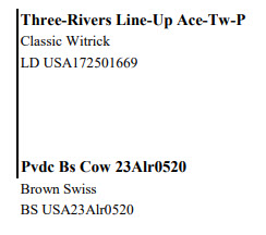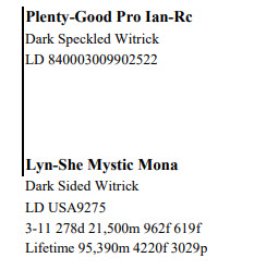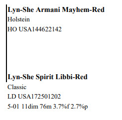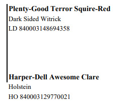 National Lineback Sale 785 Snyder Ave, Beaver Springs PA, 17812 Elite Cows, Heifers and Bulls Contact Agent: Aaron Ray Tompkins 336-363-4639 Catalog | Terms of Auction Download CATALOG Catalog | Terms Download CATALOG All Items (43) Cattle (43) Categories All Items (43) Cattle (43) Search Item #: Keyword: Search Catalog Item #: Keyword: 20 items per page 50 items per page 100 items per page Go to page #: 1 , 2 , 3 #1 – AYR-BACK WARRIOR REBEL-RED LD 840003009902359 W - C Born 12/1/2020 Dark Sided Witrick BLAD FREE Location: 785 Snyder Ave, Beaver Springs PA, 17812 Contact Agent: Aaron Ray Tompkins 336-363-4639 More Info / Bid Now Track this Item Sold High Bid: $4,200.00 – #20 #1 – AYR-BACK WARRIOR REBEL-RED Sold High Bid: $4,200 More Details More Info / Bid Track Item LD 840003009902359 W - C Born 12/1/2020 Dark Sided Witrick BLAD FREE Location: 785 Snyder Ave, Beaver Springs PA, 17812 Contact Agent: Aaron Ray Tompkins 336-363-4639 #2 – CELESTIAL-DREAM MORRIS RETRO-P LD 840003212245648 W - C Born 03/02/2020 Dark Speckled Witrick Eartag# 767 Exposed to Bull: Pretty-Stitches Cosmo General-Red Dark Sided Witrick Dam: PS Spark Glee-Red-Ocp EX-91 EEEEE 2-11 300dim 28,363m 3.9% 1092f 2.7% 758p Lifetime 868dim 66,566m 2545f 1820p Location: 785 Snyder Ave, Beaver Springs PA, 17812 Contact Agent: Aaron Ray Tompkins 336-363-4639 More Info / Bid Now Track this Item No Bids Starting at $500.00 Login to Bid #2 – CELESTIAL-DREAM MORRIS RETRO-P Starting at $500.00 Login to Bid More Details More Info / Bid Track Item LD 840003212245648 W - C Born 03/02/2020 Dark Speckled Witrick Eartag# 767 Exposed to Bull: Pretty-Stitches Cosmo General-Red Dark Sided Witrick Dam: PS Spark Glee-Red-Ocp EX-91 EEEEE 2-11 300dim 28,363m 3.9% 1092f 2.7% 758p Lifetime 868dim 66,566m 2545f 1820p Location: 785 Snyder Ave, Beaver Springs PA, 17812 Contact Agent: Aaron Ray Tompkins 336-363-4639 #3 – CELESTIAL-DREAM SPARK PRECIOUS LD 840003212245649 W-C Born 03/11/2020 Dark Sided Witrick Eartag #768 Exposed to Bull: Pretty-Stitches Cosmo General-Red Dark Sided Witrick Dam: PS Spark Glee-Red-Ocp EX-91 EEEEE 2-11 300dim 28,363m 3.9% 1092f 2.7% 758p Lifetime 868dim 66,566m 2545f 1820p Location: 785 Snyder Ave, Beaver Springs PA, 17812 Contact Agent: Aaron Ray Tompkins 336-363-4639 More Info / Bid Now Track this Item Sold High Bid: $850.00 – #13 #3 – CELESTIAL-DREAM SPARK PRECIOUS Sold High Bid: $850 More Details More Info / Bid Track Item LD 840003212245649 W-C Born 03/11/2020 Dark Sided Witrick Eartag #768 Exposed to Bull: Pretty-Stitches Cosmo General-Red Dark Sided Witrick Dam: PS Spark Glee-Red-Ocp EX-91 EEEEE 2-11 300dim 28,363m 3.9% 1092f 2.7% 758p Lifetime 868dim 66,566m 2545f 1820p Location: 785 Snyder Ave, Beaver Springs PA, 17812 Contact Agent: Aaron Ray Tompkins 336-363-4639 #4 – CELESTIAL-DREAM MORRIS RAERAE LD 840003212245645 W-C Born 01/01/2020 Dark Speckled Witrick Eartag #764 Exposed to Bull: Pretty-Stitches Cosmo General-Red Dark Sided Witrick Dam: PS Spark Glee-Red-Ocp EX-91 EEEEE 2-11 300dim 28,363m 3.9% 1092f 2.7% 758p Lifetime 868dim 66,566m 2545f 1820p Location: 785 Snyder Ave, Beaver Springs PA, 17812 Contact Agent: Aaron Ray Tompkins 336-363-4639 More Info / Bid Now Track this Item Sold High Bid: $975.00 – #1011 #4 – CELESTIAL-DREAM MORRIS RAERAE Sold High Bid: $975 More Details More Info / Bid Track Item LD 840003212245645 W-C Born 01/01/2020 Dark Speckled Witrick Eartag #764 Exposed to Bull: Pretty-Stitches Cosmo General-Red Dark Sided Witrick Dam: PS Spark Glee-Red-Ocp EX-91 EEEEE 2-11 300dim 28,363m 3.9% 1092f 2.7% 758p Lifetime 868dim 66,566m 2545f 1820p Location: 785 Snyder Ave, Beaver Springs PA, 17812 Contact Agent: Aaron Ray Tompkins 336-363-4639 #5 – CELESTIAL-DREAM INAVATOR VIRUS LD 840003212245646 Born 01/02/2020 Dark Sided Witrick Eartag #76 Exposed to Bull: Pretty-Stitches Cosmo General-Red Dark Sided Witrick Dam: PS Spark Glee-Red-Ocp EX-91 EEEEE 2-11 300dim 28,363m 3.9% 1092f 2.7% 758p Lifetime 868dim 66,566m 2545f 1820p Location: 785 Snyder Ave, Beaver Springs PA, 17812 Contact Agent: Aaron Ray Tompkins 336-363-4639 More Info / Bid Now Track this Item No Bids Starting at $500.00 Login to Bid #5 – CELESTIAL-DREAM INAVATOR VIRUS Starting at $500.00 Login to Bid More Details More Info / Bid Track Item LD 840003212245646 Born 01/02/2020 Dark Sided Witrick Eartag #76 Exposed to Bull: Pretty-Stitches Cosmo General-Red Dark Sided Witrick Dam: PS Spark Glee-Red-Ocp EX-91 EEEEE 2-11 300dim 28,363m 3.9% 1092f 2.7% 758p Lifetime 868dim 66,566m 2545f 1820p Location: 785 Snyder Ave, Beaver Springs PA, 17812 Contact Agent: Aaron Ray Tompkins 336-363-4639 #6 – CELESTIAL-DREAM MORRIS DEWEY LD 840003212245642 Born 11/01/2019 Dark Speckled Witrick Eartag #761 Exposed to Bull: Pretty-Stitches Cosmo General-Red Dark Sided Witrick Dam: PS Spark Glee-Red-Ocp EX-91 EEEEE 2-11 300dim 28,363m 3.9% 1092f 2.7% 758p Lifetime 868dim 66,566m 2545f 1820p Location: 785 Snyder Ave, Beaver Springs PA, 17812 Contact Agent: Aaron Ray Tompkins 336-363-4639 More Info / Bid Now Track this Item No Bids Starting at $500.00 Login to Bid #6 – CELESTIAL-DREAM MORRIS DEWEY Starting at $500.00 Login to Bid More Details More Info / Bid Track Item LD 840003212245642 Born 11/01/2019 Dark Speckled Witrick Eartag #761 Exposed to Bull: Pretty-Stitches Cosmo General-Red Dark Sided Witrick Dam: PS Spark Glee-Red-Ocp EX-91 EEEEE 2-11 300dim 28,363m 3.9% 1092f 2.7% 758p Lifetime 868dim 66,566m 2545f 1820p Location: 785 Snyder Ave, Beaver Springs PA, 17812 Contact Agent: Aaron Ray Tompkins 336-363-4639 #7 – CELESTIAL-DREAM MORR AMMO LD 840003212245646 Born 09/02/2020 Classic Eartag #777 Location: 785 Snyder Ave, Beaver Springs PA, 17812 Contact Agent: Aaron Ray Tompkins 336-363-4639 More Info / Bid Now Track this Item No Bids Starting at $500.00 Login to Bid #7 – CELESTIAL-DREAM MORR AMMO Starting at $500.00 Login to Bid More Details More Info / Bid Track Item LD 840003212245646 Born 09/02/2020 Classic Eartag #777 L