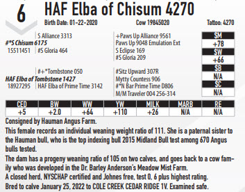 Birth Date: 01-22-2020 Cow 19845020 Tattoo: 4270 Consigned by Hauman Angus Farm.
