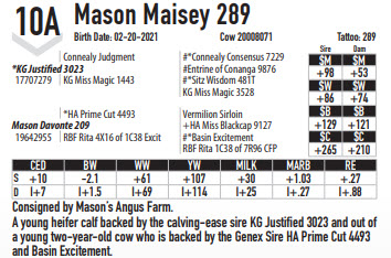 Birth Date: 02-20-2021 Cow 20008071 Tattoo: 289 Consigned by Mason’s Angus Farm.
