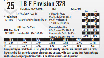 Birth Date: 03-12-2020 Bull Tattoo: 328 Consigned by Ice Brook Farm. • This young bull is sired by Genex AI sire Envision, who is a calving-ease sire that also offers plenty of growth and carcass. • His dam comes from Hauman Angus