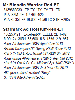 (5) Reverse sorted IVF female embryos Domestic only • Location: Trans Ova, MD Maternal sisters to embryos: Miss Hot Mama-Red-ET EX-92 •Holstein USA Star of the Breed 2017 •All-American R&W Milking Yearling 2015 Miss Real Hot-Red EX-92
