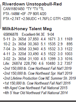 • (2) #1 IVF embryos from sexed semen • (3) #2 IVF embryos from sexed semen Domestic only • Location: Cedar Lane Farm Maternal sister to embryos: Milk&Honey Windbrook Megan EX-90 5-04 2x 365d 40,300 3.8 1546 3.3 1346